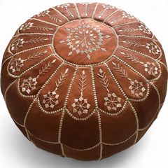 Our authentic Tan Brown Embroidered Moroccan Leather Ottoman Pouffe is made entirely by hand by highly skilled leather artisans in Marrakech, and hand embroidered with silk thread highlighting the intricacy and detail of the Moroccan design.